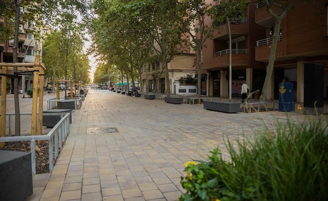Posteriormente, se ha completado la transformación del espacio en plataforma única hasta la fachada mar, creándose una zona pacificada, sin vehículos aparcados, sombreado y abierto. El objetivo es convertir este espacio en una vía de acceso a los equipamientos escolares y cívicos, al parque y al casco antiguo de Les Corts, aumentando el espacio peatonal y eliminándose el espacio para aparcamiento de vehículos y para carga y descarga.