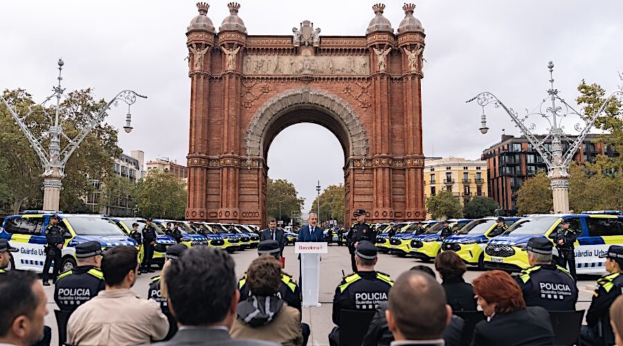 6-11-2025 / El alcalde de Barcelona, ​​Jaume Collboni, presentó ayer tarde los 21 nuevos vehículos que se incorporan en el parque móvil de la Guardia Urbana. Estuvo acompañado por el teniente de alcalde de Seguridad Albert Batlle y el Jefe de la Guardia Urbana, Pedro Velázquez.
