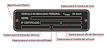 Desde el 22 de enero de 2024 solo se puede comercializar este tipo de VMP y en la web de DGT el ciudadano puede consultar las marcas y modelos certificados. Los modelos certificados incorporan una placa de marcaje de fábrica única, permanente y legible tal y como se muestra en la imagen: