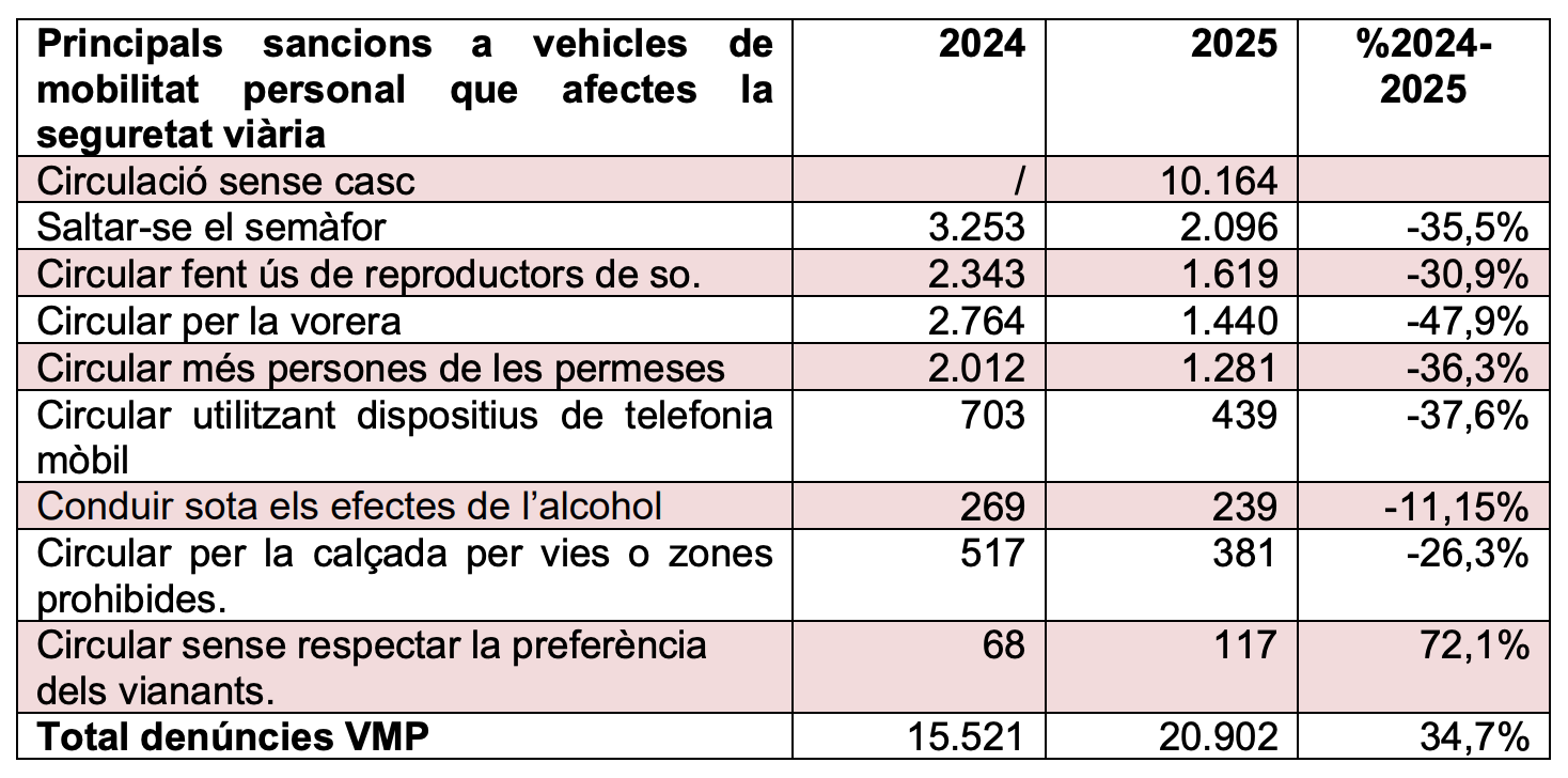 L’any passat es van interposar un total de 20.902 denúncies a conductors de VMP, un 34,7% més respecte l’any 2024. Aquest augment està provocat per les sancions per circular sense casc, en vigor des de fa just un any. Per aquest concepte es van tramitar 10.164 sancions.