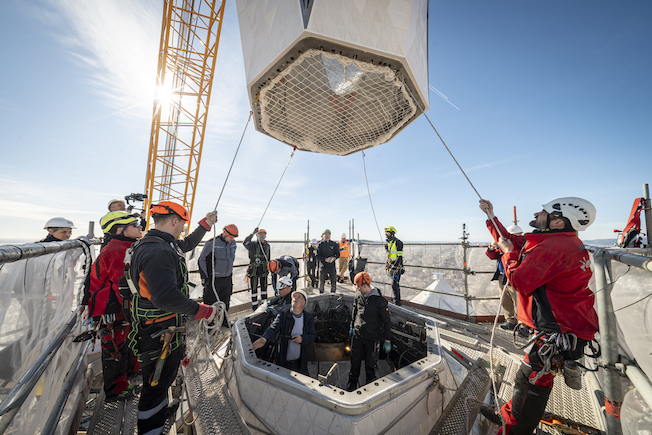 Esta pieza mide 4,5 x 4,5x 4,9 metros de altura y se convierte en el elemento más alto del templo y, con su instalación, queda completado el conjunto de las seis torres centrales de la Sagrada Família.